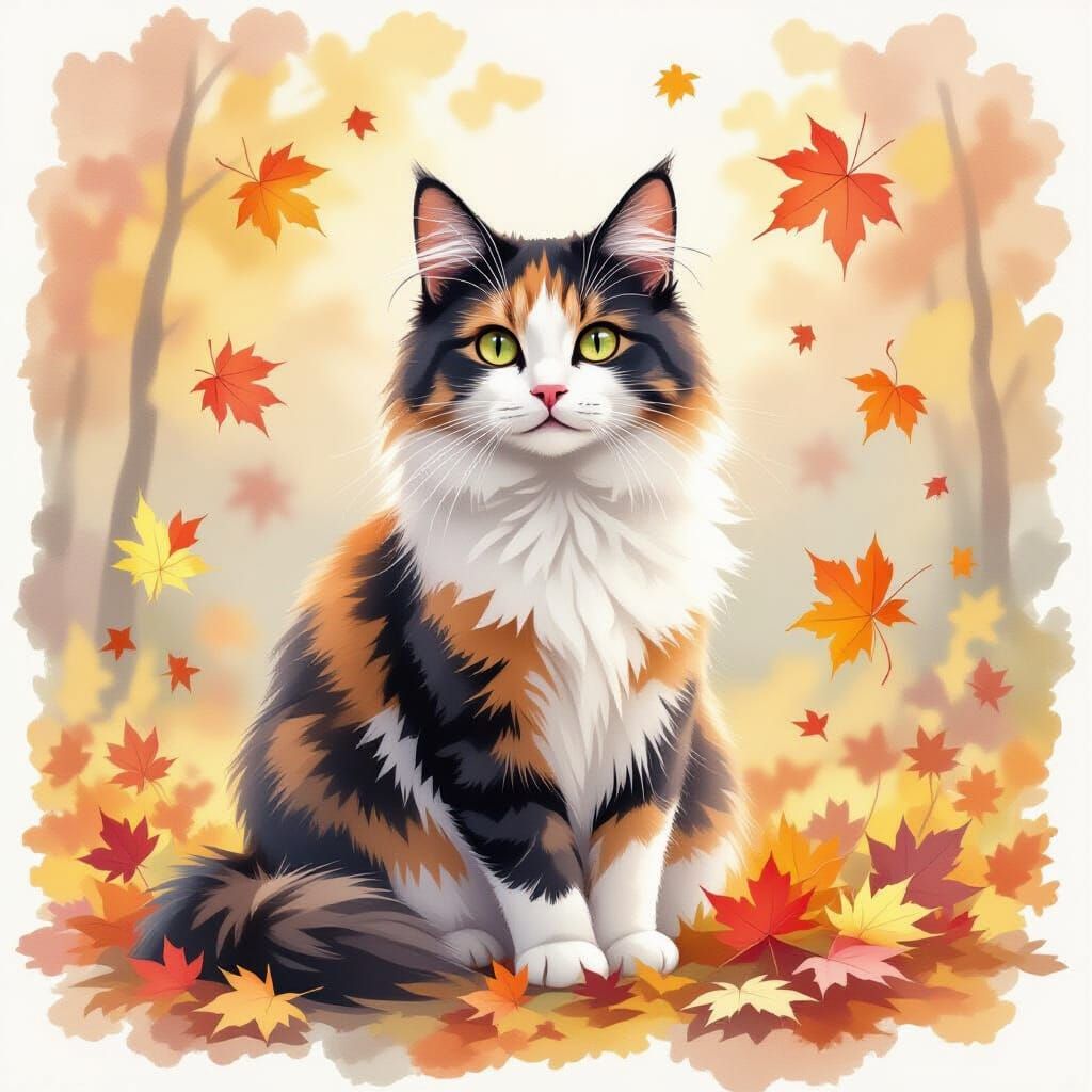 A serene calico cat rests among falling autumn leaves, depicted in a soft watercolor style with gentle brushstrokes and warm pastel hues. The art evokes a calm, dreamlike atmosphere.