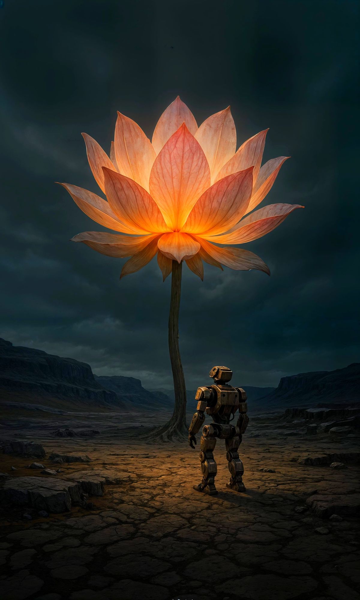 This image shows a small robot dwarfed by a gigantic, glowing lotus flower in a desolate landscape, rendered with hyper-detailed textures. The flower emits a soft, ethereal light, contrasting with the overcast sky.