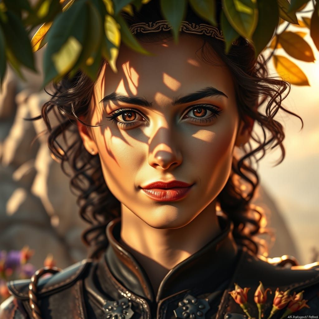 This image shows a serene and confident female warrior with a warm, golden glow. She wears elegant medieval armor with leather accents and has curly dark hair, set against a soft, natural background with dappled sunlight filtering through trees.