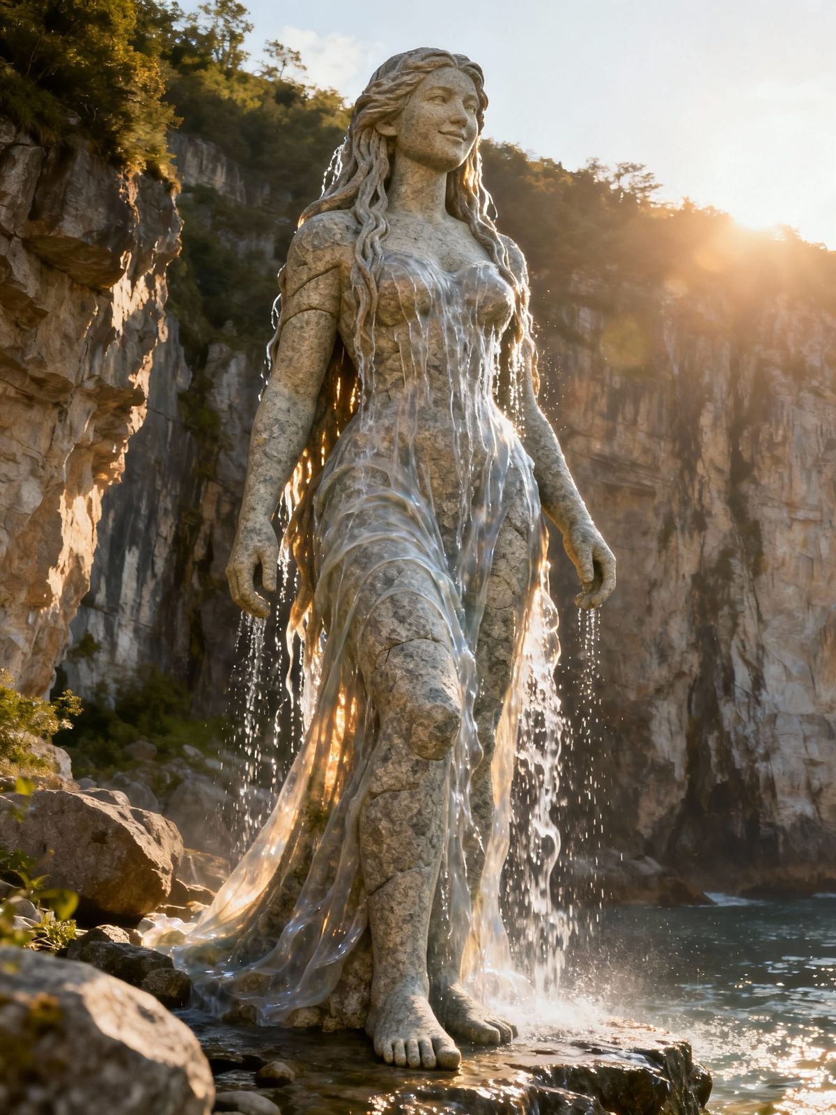 This photorealistic image shows a beautiful stone giantess with a kind expression, featuring hair and a dress made of cascading waterfalls on a sunny day with a cliff background.
