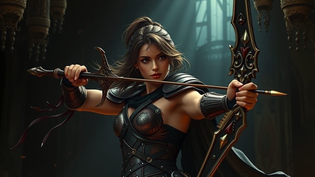 A stunning image of a hunter in leather and metal armor with bow and arrow. The scene is set in a dense, mysterious atmosphere with dramatic lighting, rendered as maximalist digital matte painting.