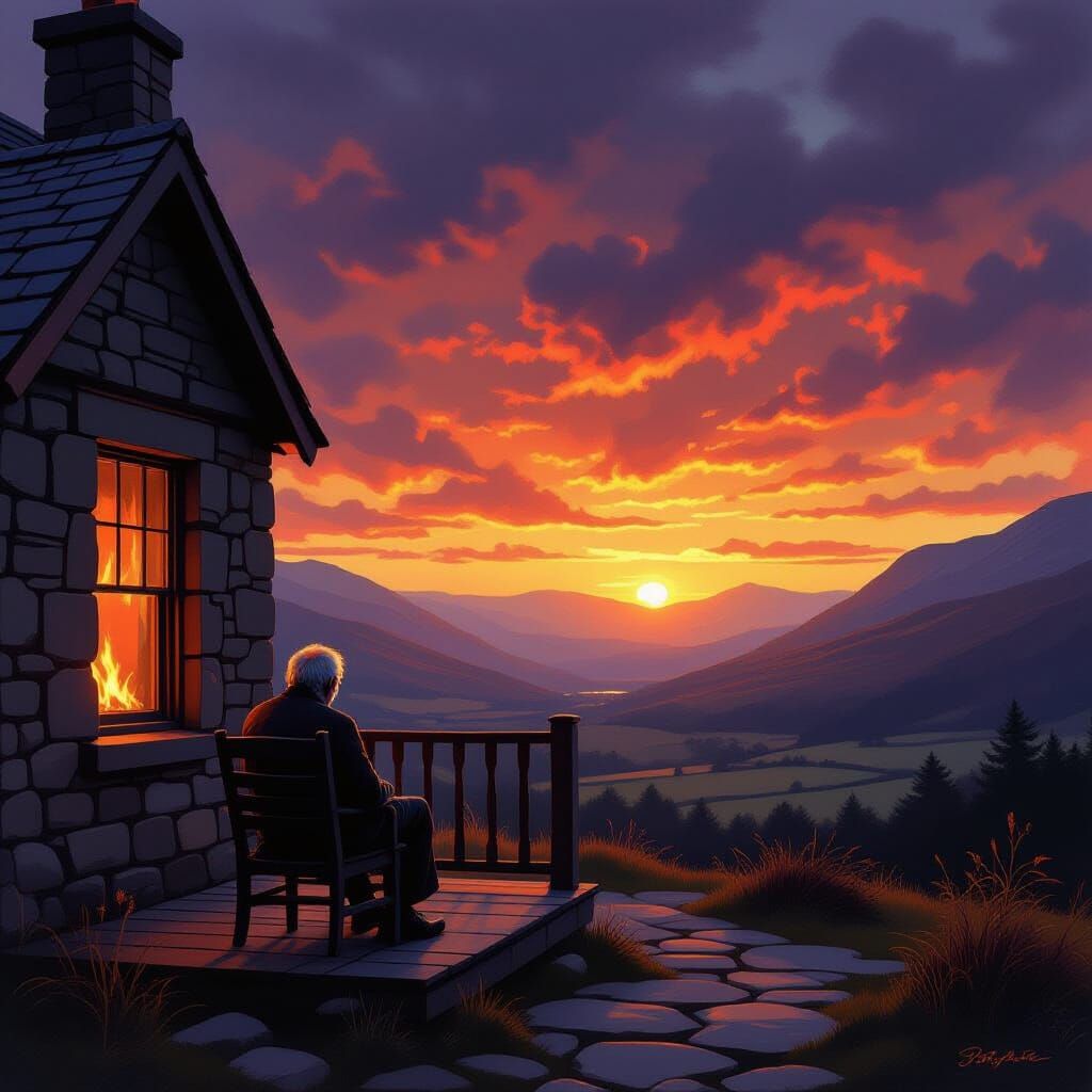 A stone cottage in the Scottish Highlands at sunset. An old man on the porch gazes at the fiery sky, filled with longing. Painted with rich colors and soft light, evoking melancholic beauty.