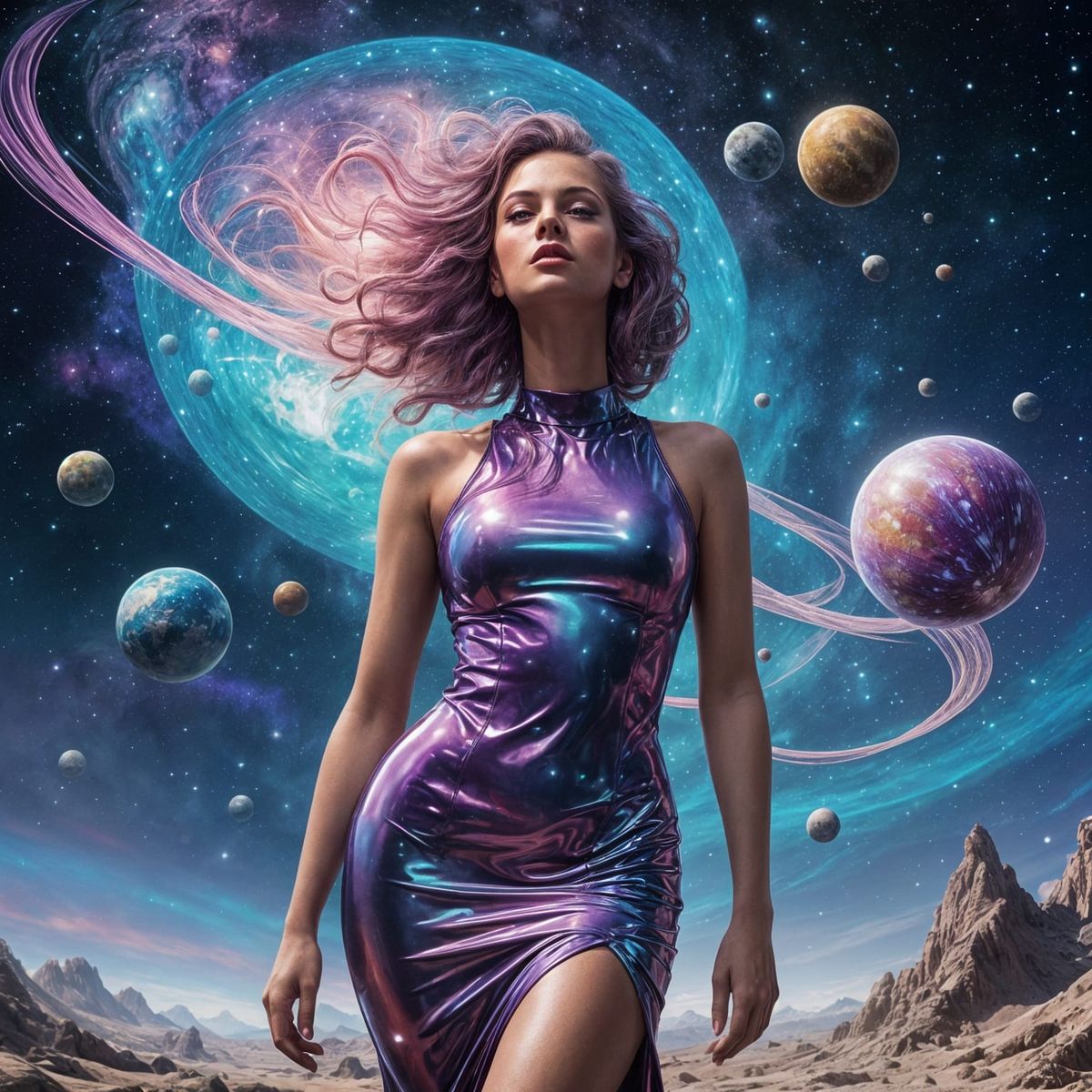 This image shows a stunning woman in a vibrant, high-gloss latex dress, set against a celestial backdrop. The intricate details of her hair and the dress itself create a hyperrealistic effect.