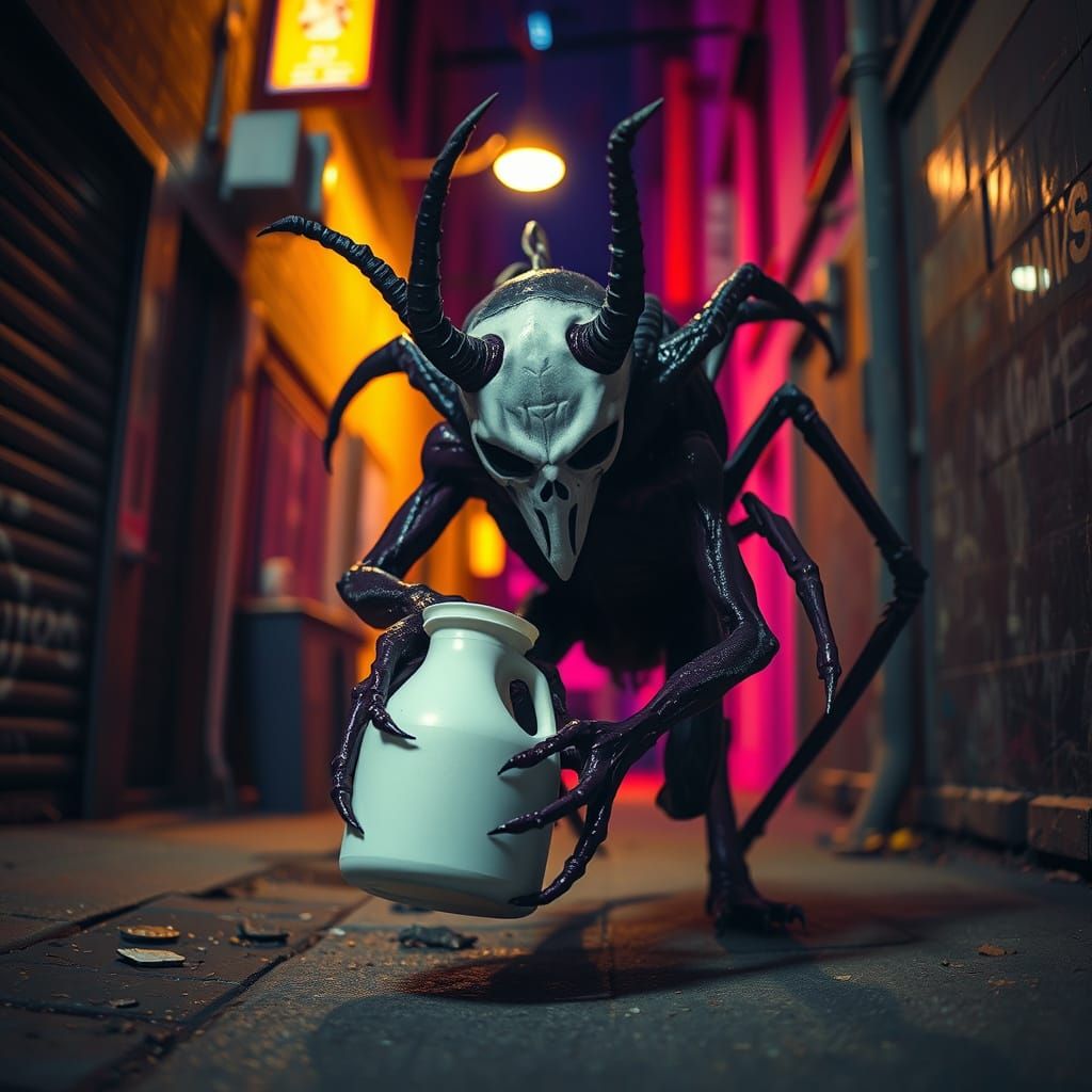 A cinematic image shows a void demon crawling through a city alleyway while holding a milk jug. This hyperrealistic image features intricate textures, dynamic lighting, and a color palette reminiscent of Art Nouveau.