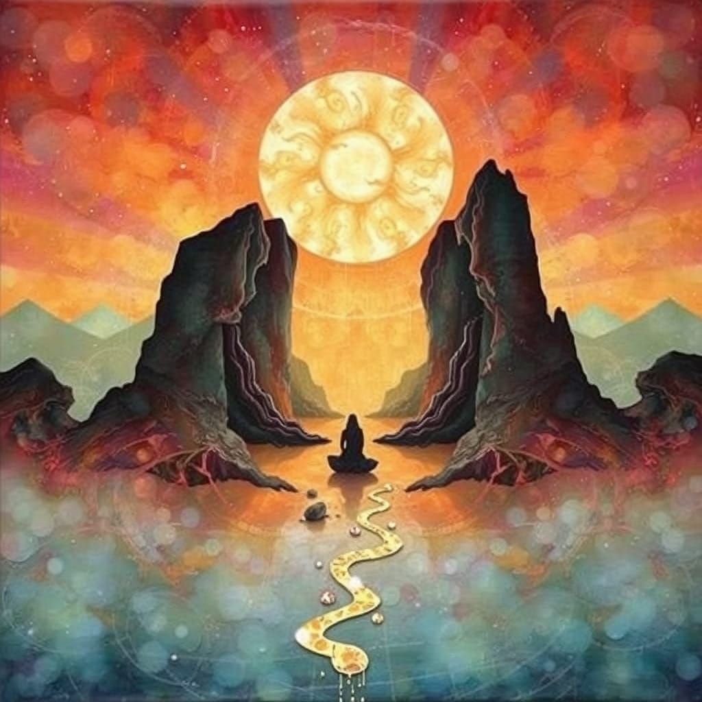 A surreal panoramic landscape featuring dream-temple fields and cavernous architecture. The image is rich with detail, resembling compressed paper, honey-foil, velvet, and bioluminescent stained glass dust.
