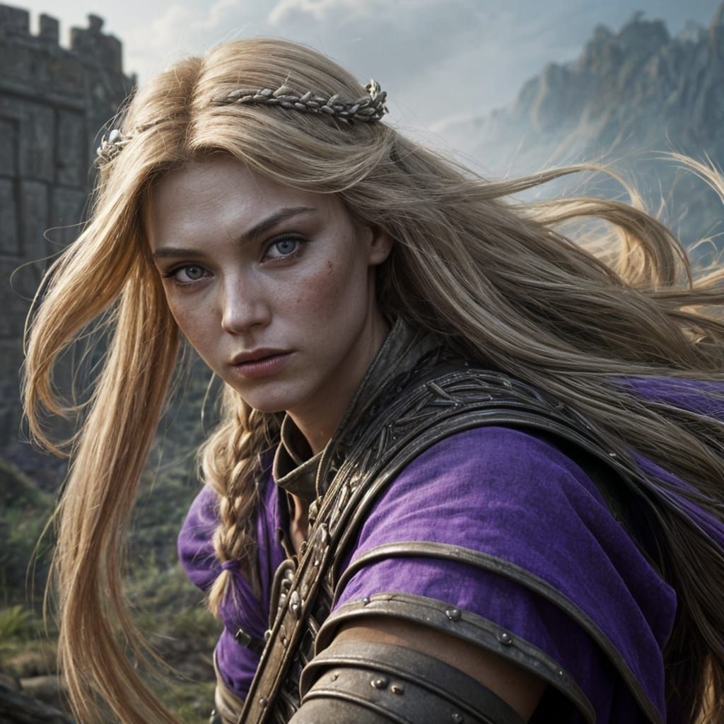 A full body portrait depicts a slender, beautiful, and fierce warrior princess with long blonde hair. This striking image showcases realistic details and robust colors in a cinematic style.