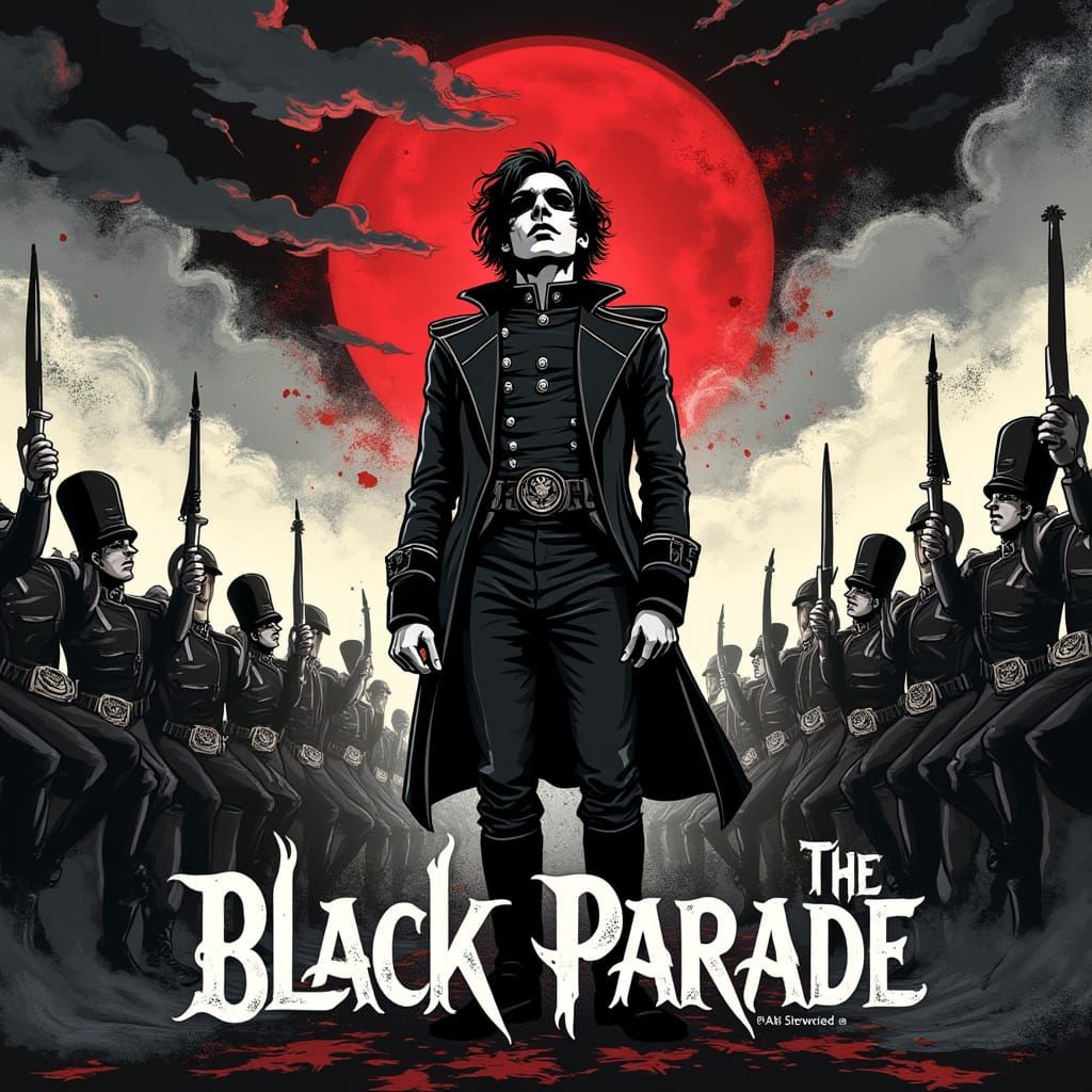 A dark, emo cartoon reimagining of My Chemical Romance's "The Black Parade" album cover, featuring Gerard Way. The artwork uses intricate linework and atmospheric mood with vibrant, shadowy colors.