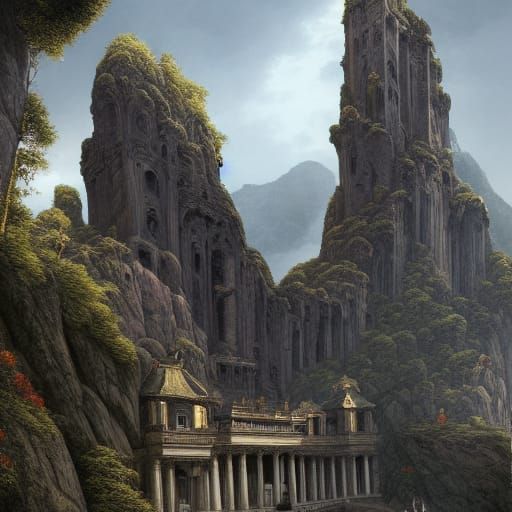 A breathtaking view of an elaborate palace carved into towering basalt cliffs. The image is highly detailed, with an aesthetic reminiscent of digital fantasy art.