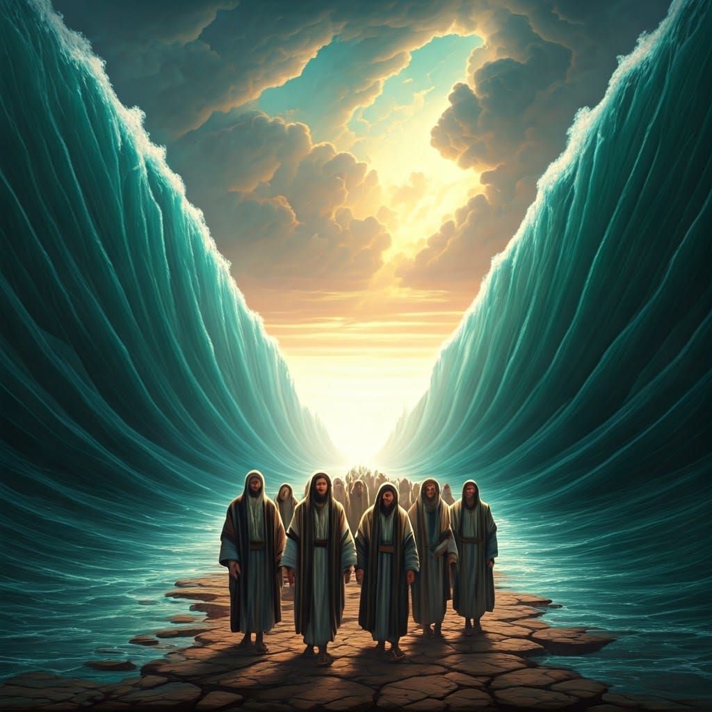 This breathtaking scene depicts the Jewish people marching through the dry land path in the middle of the Red Sea, surrounded by towering walls of water, illuminated by divine light and dramatic clouds, evoking the style of Turner, Caravaggio, and Bierstadt.