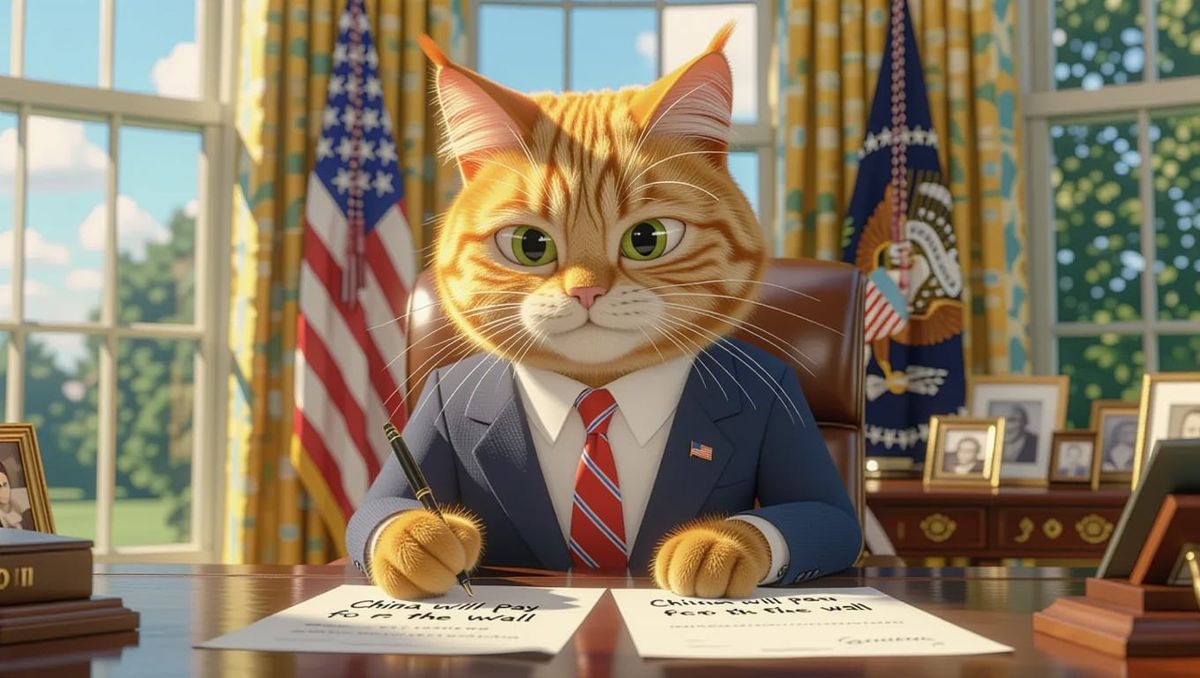 A 3D rendered image of a cat president with orange hair wearing a suit in the Oval Office. The cat is writing on White House documents in a Pixar-inspired style.