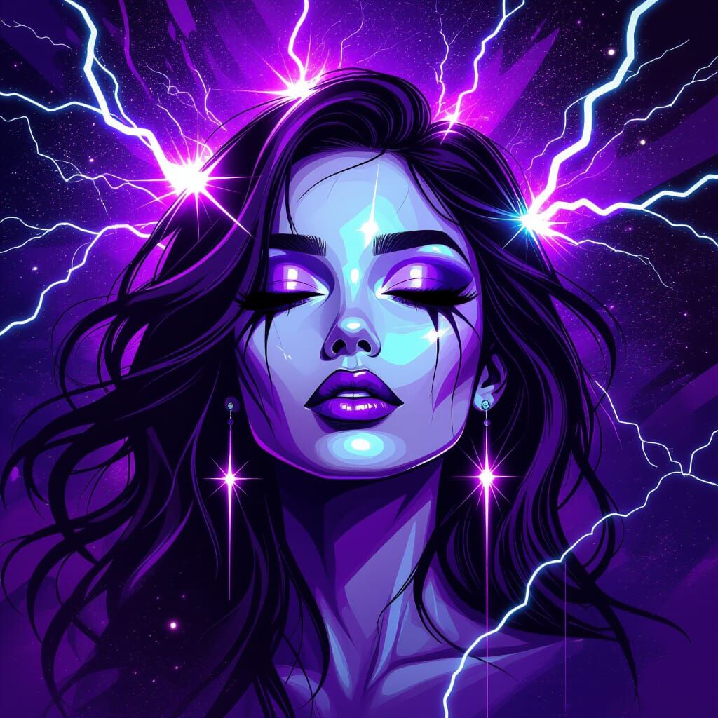 A vibrant image of a goddess's face dissolving into purple, black, and white. The artwork combines graffiti, splash, and street art techniques in a high-contrast, polychromatic style.