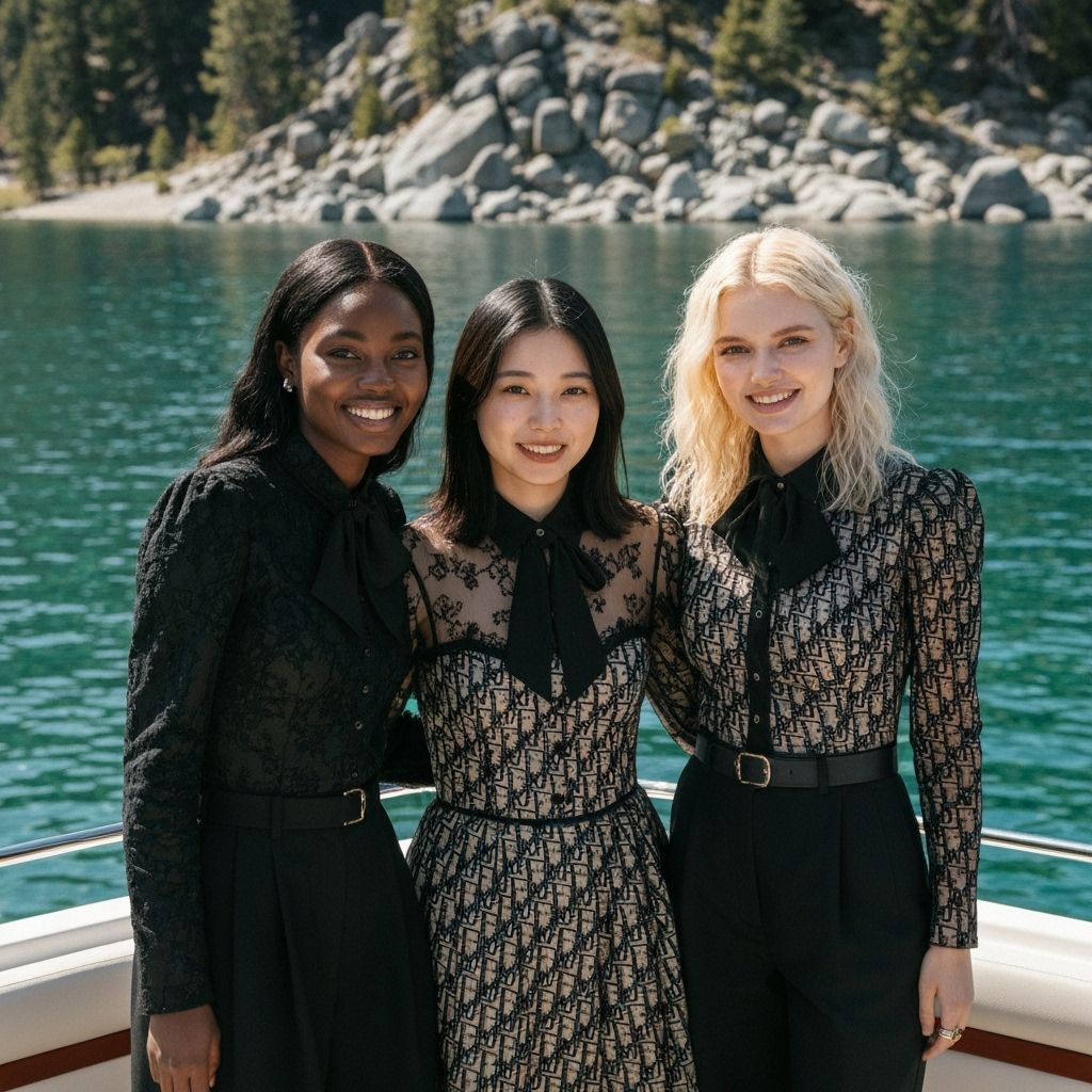 This image shows three smiling women of Black, Japanese, and White ethnicity standing on a boat in Lake Tahoe. They are wearing intricate gothic Dior clothing and the image utilizes bokeh, natural lighting, and sharp focus.