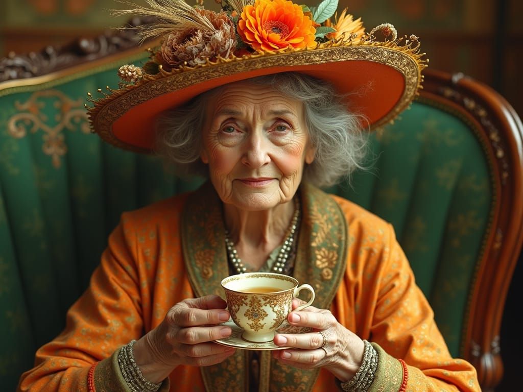 This image shows a serene and elegant woman in a warm, golden light, surrounded by opulent colors and intricate, flowing lines reminiscent of Art Nouveau. She cradles a delicate cup of steaming tea, wearing a lavish hat adorned with vibrant feathers and flowers.