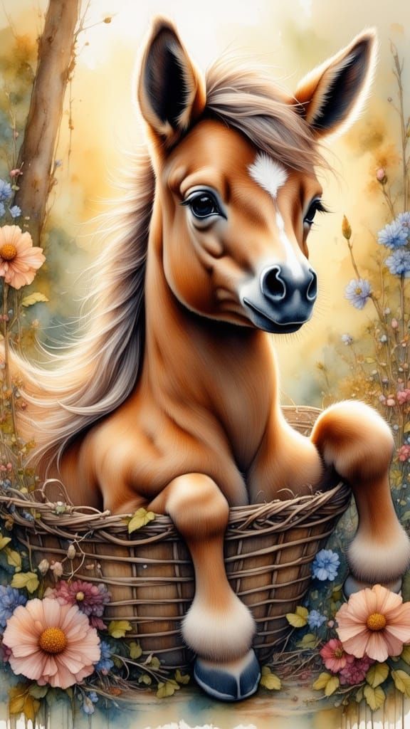 This charming image depicts a Falabella horse foal nestled in a vintage basket, rendered in warm, inviting watercolor hues. The delicate scene exudes a sense of cuteness and nostalgia.