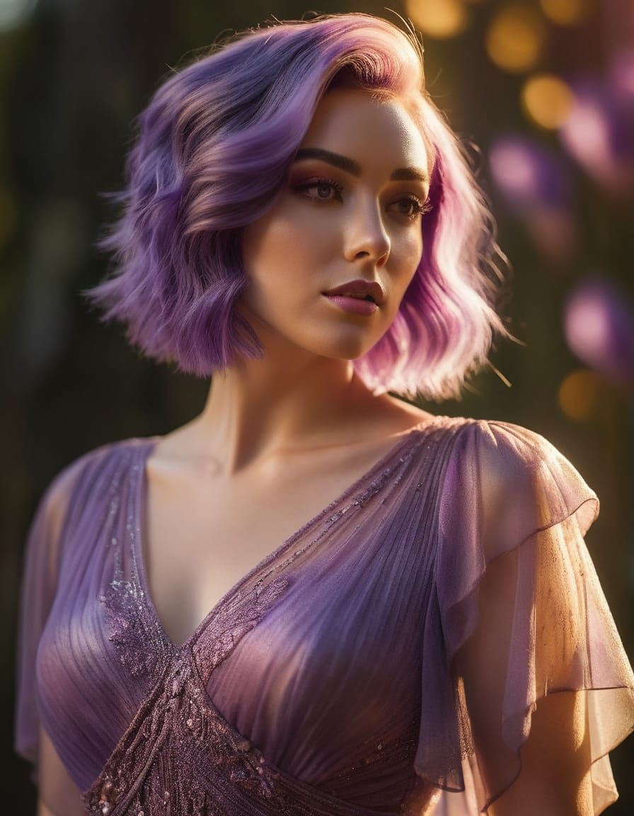 This image shows a young woman with violet hair and eyes in a sheer dress, bathed in golden light. The soft, vibrant colors and painterly brushstrokes give it a cinematic, hyper-realistic aesthetic.