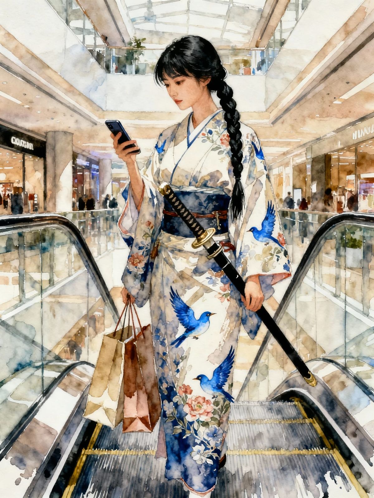 This image shows a samurai woman with a long braid and detailed kimono, holding shopping bags and a phone on a modern mall escalator. Created in a watercolor alcohol wet art style.