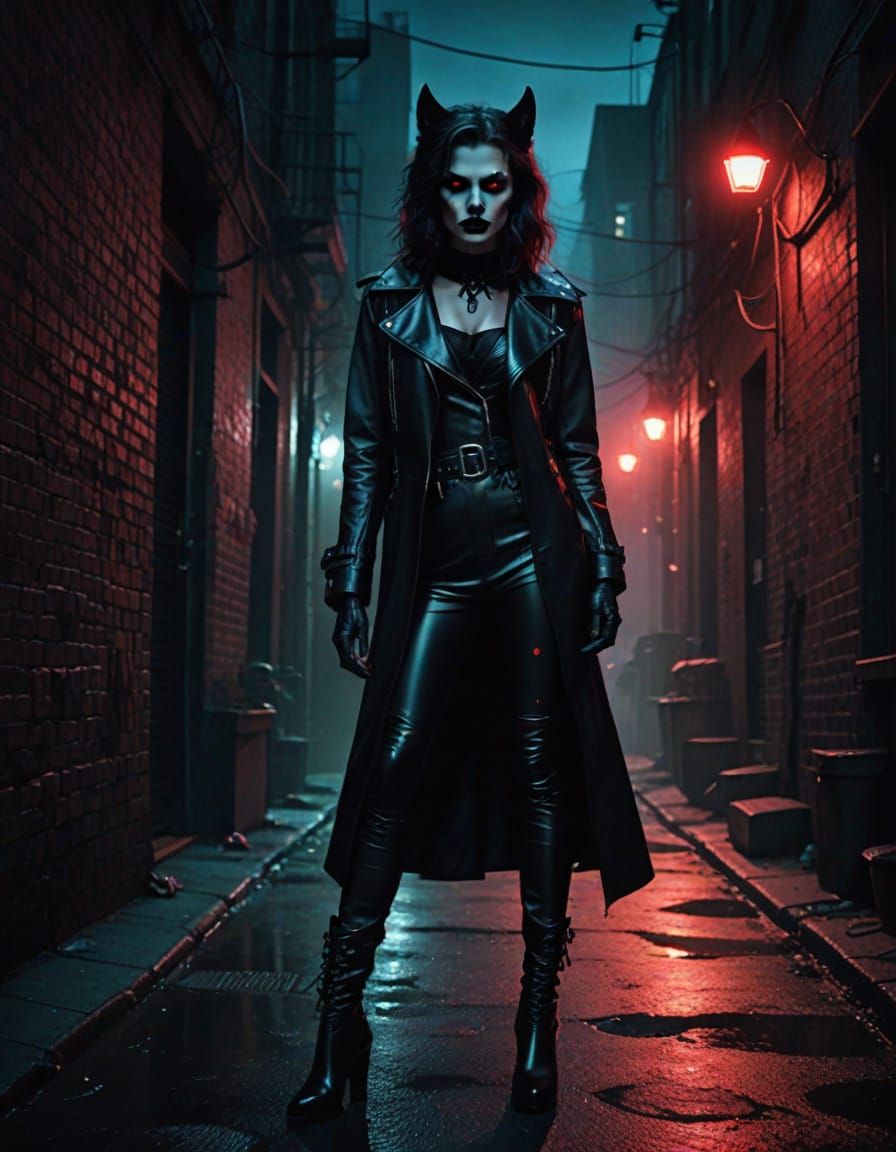 This image shows a female werewolf in a gothic urban alley. She has glowing red eyes, wears a latex skirt and black boots, and is surrounded by crimson fog in a film noir atmosphere.