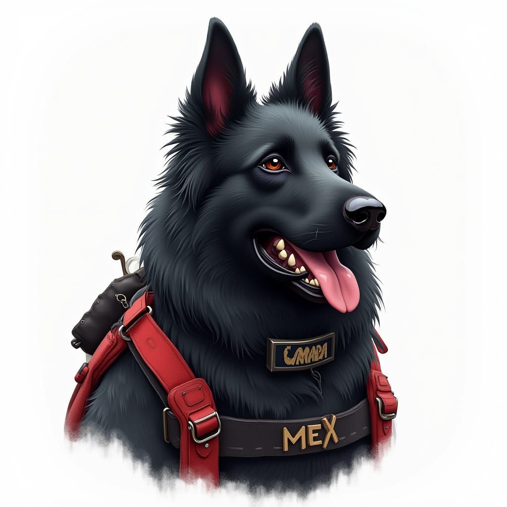 This image shows a black, long-haired German Shepherd wearing a parachute harness against a white backdrop. The artwork is a detailed matte painting with deep complementary colors and metallic accents.