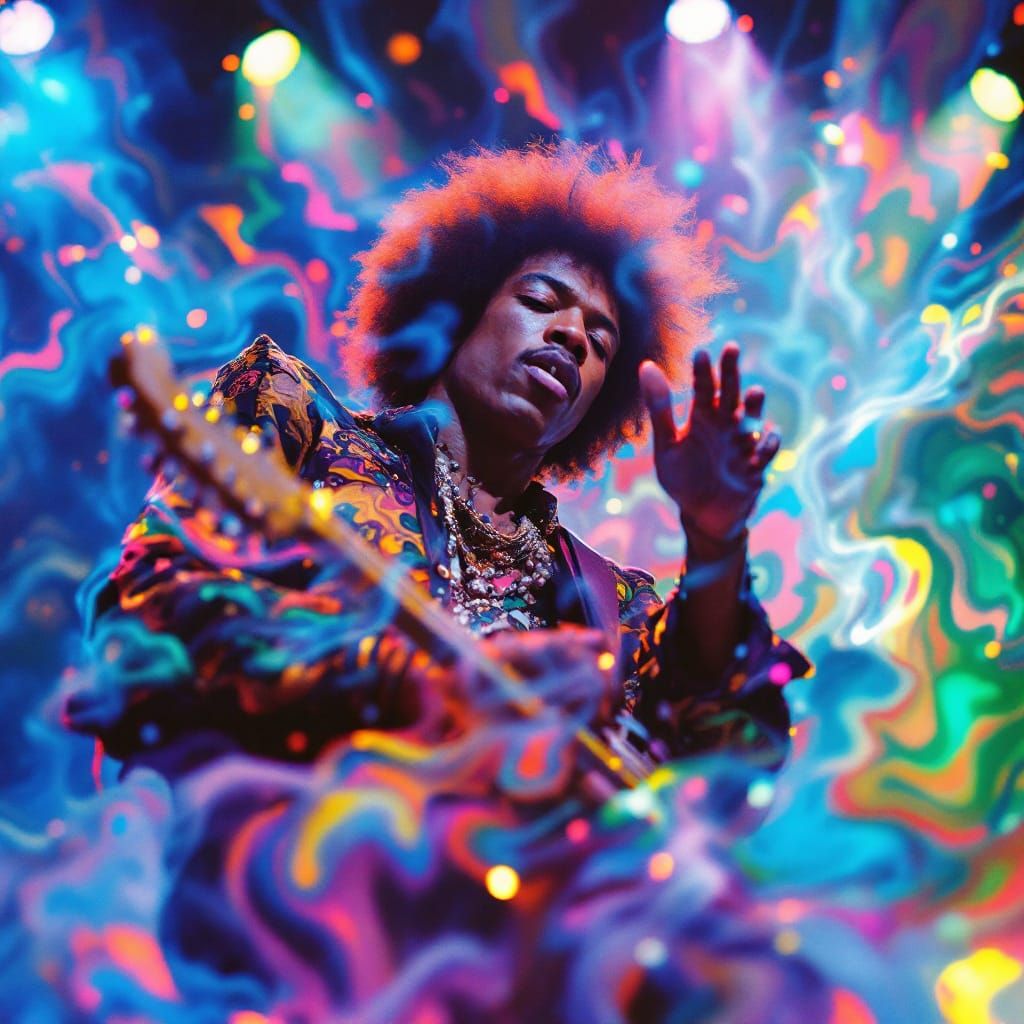 This image captures a close-up of Jimi Hendrix performing on stage, bathed in vibrant, swirling colorful lights. The scene evokes 1960s rock poster aesthetics with saturated colors and dynamic energy.