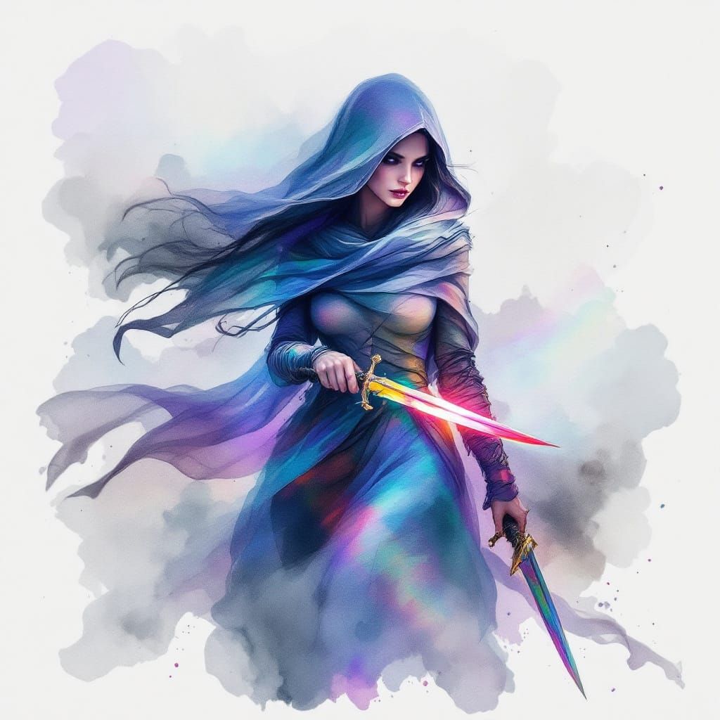 This image shows a mysterious rogue woman in shimmering, iridescent cloaks, her daggers reflecting rainbow light. Rendered as a fluid watercolor painting with soft, blended brushstrokes and translucent colors.