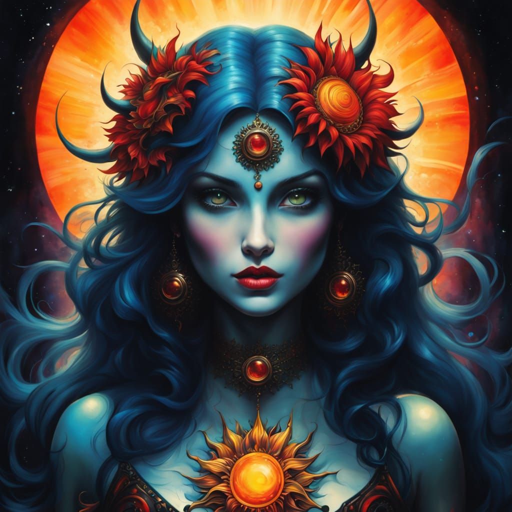 This image shows a vibrant, comic-style sun tattoo with deep saturation and high contrast, featuring crisp lines and a sense of magic and fantasy.