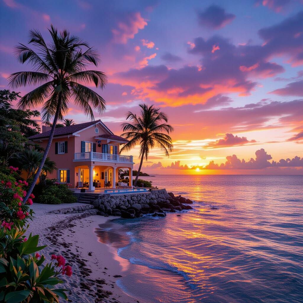 This detailed matte painting showcases a colorful colonial house by the sea in Guadeloupe, framed by palm trees under a vivid tropical sunset. Warm hues reflect on the calm ocean, creating a dreamlike, fantastical atmosphere.