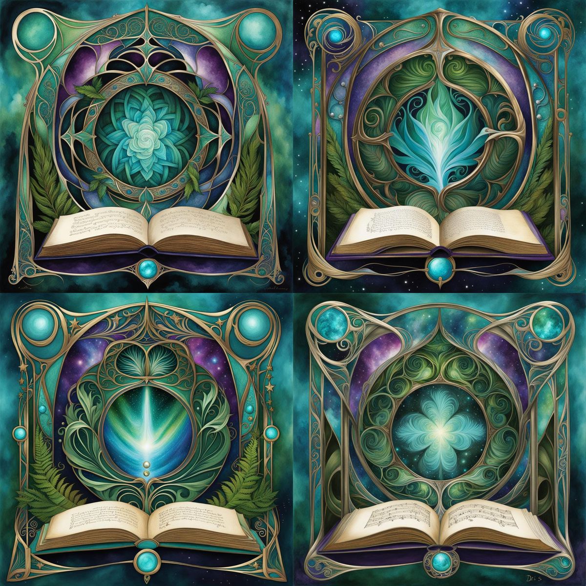 This image shows an Art Nouveau-style watercolour of a fractal tunnel with fern-like structures. The color palette features blues, greens, and metallic tones, framed by a prayer book.