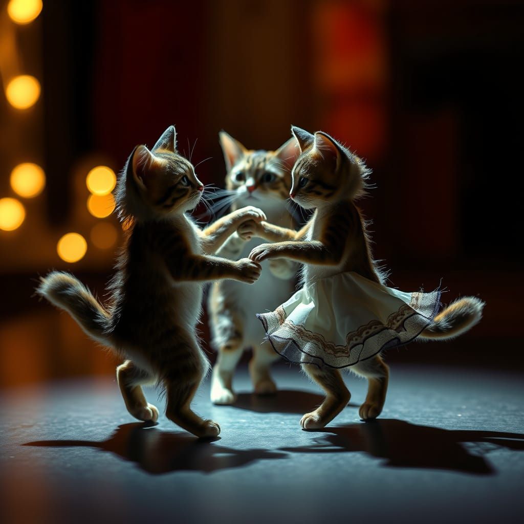 This image shows realistic kittens dancing gracefully in warm light. The artwork is a hybrid style, combining photographic textures and details with digital painting techniques.