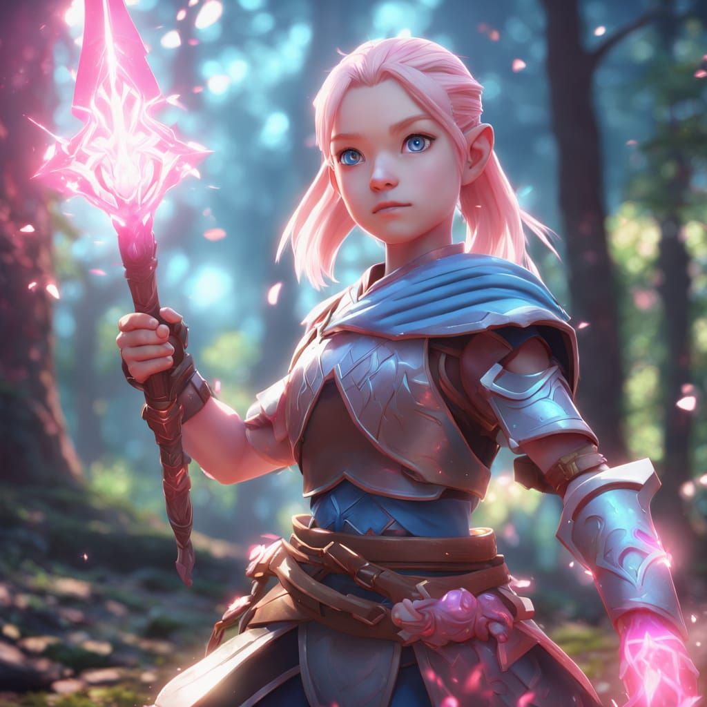 This image shows a close up 3D anime style portrait of a halfling female fighter monk in a wooded setting. She has a glowing pink aura, light blue eyes, and is rendered in soft pastel colors.