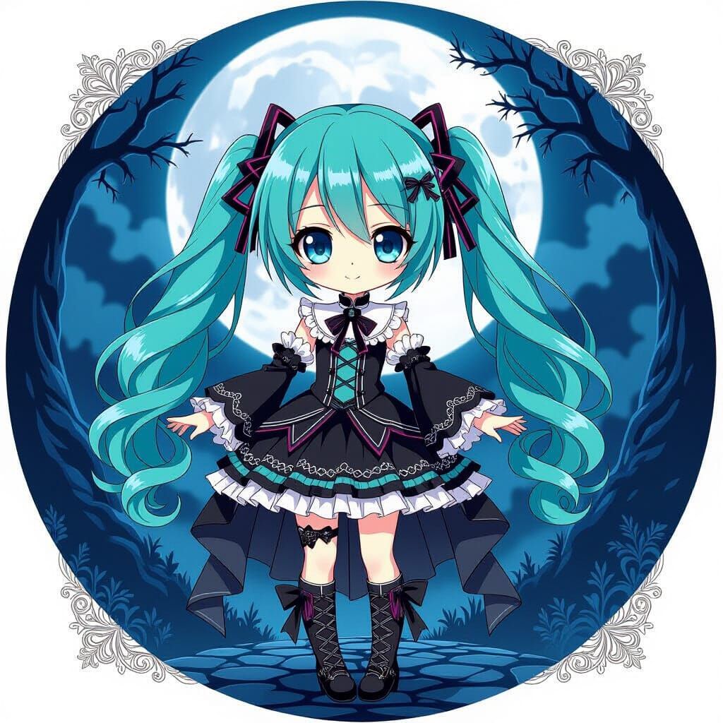 This image shows a chibi Hatsune Miku in a black and white gothic lolita dress with lace and ribbons, set in a moonlit environment. The artwork has a vibrant, stylized blend of kawaii and dark fantasy.
