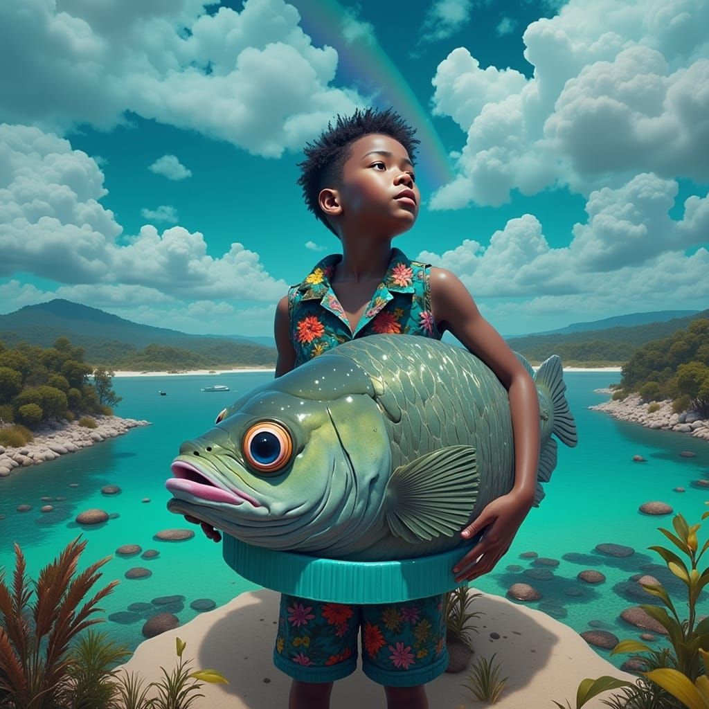 A vibrant image of a boy on the beach in Madagascar, photographed in HD. The scene blends 3D realism with a surreal artistic style, capturing a sense of peaceful wonder under a blue sky.