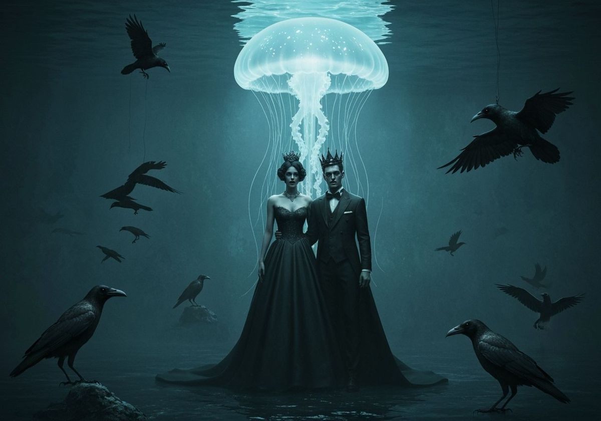 A striking image of a gothic zombie prom king and queen, depicted as a jellyfish against a dark sky, with crows near water. Features deep shadows and bioluminescence for a chilling, ethereal feel.