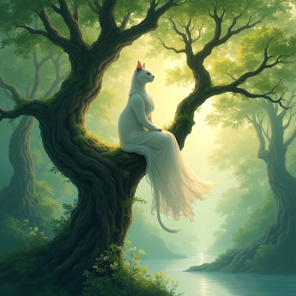 This serene watercolor painting depicts a mystical cat with a woman's face perched on a gnarled tree, surrounded by a lush forest in warm, golden light, with delicate brushstrokes and vibrant colors.