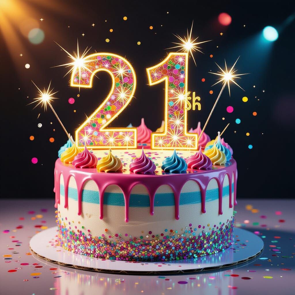 This image shows a festive 21st birthday cake, decorated with edible glitter, gold number 21, and colorful frosting. Rendered in a pop art style with bold colors and energetic lines.