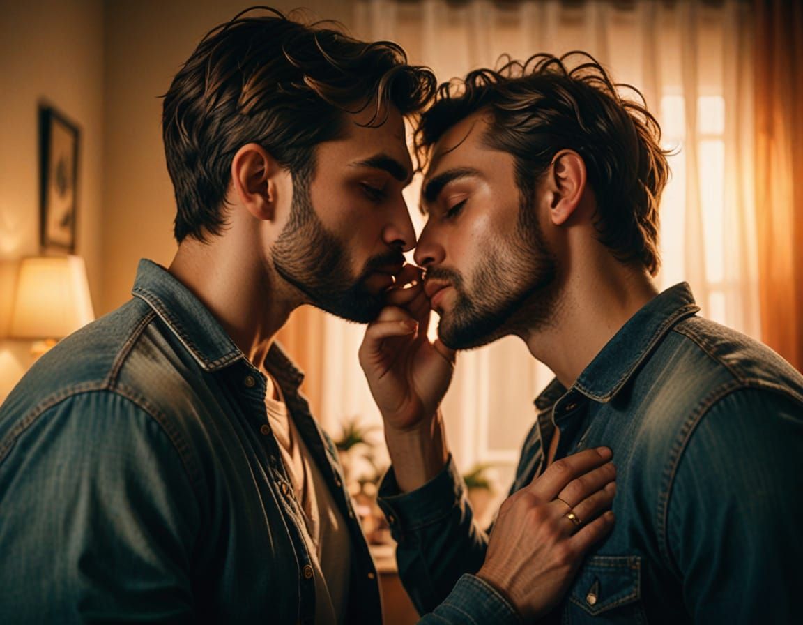 This image shows two muscular men kissing in a bedroom. The scene is bathed in cinematic lighting and features soft focus on skin, sharp clothing details and atmospheric shadows. The digital artwork evokes intimacy and romance.