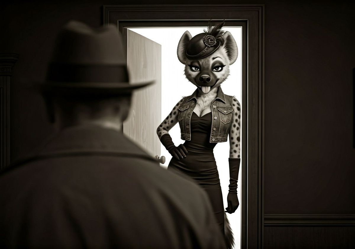 A black and white image of a film noir detective in sepia tones. The scene features cinematic shadows and a she-hyena in a black dress and denim vest standing in the backlit doorway of the detective's office.