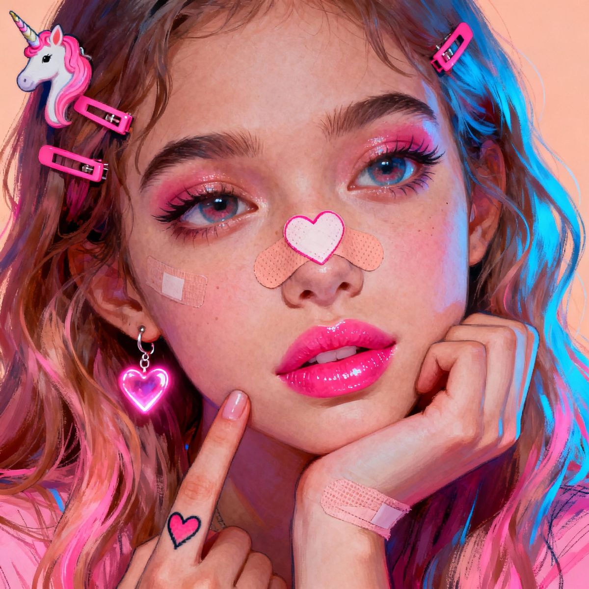 This digital painting showcases a pretty girl with pink hair accessories and makeup, featuring a heart-shaped plaster on her nose and delicate unicorn earrings. The hyperrealistic style highlights intricate details.