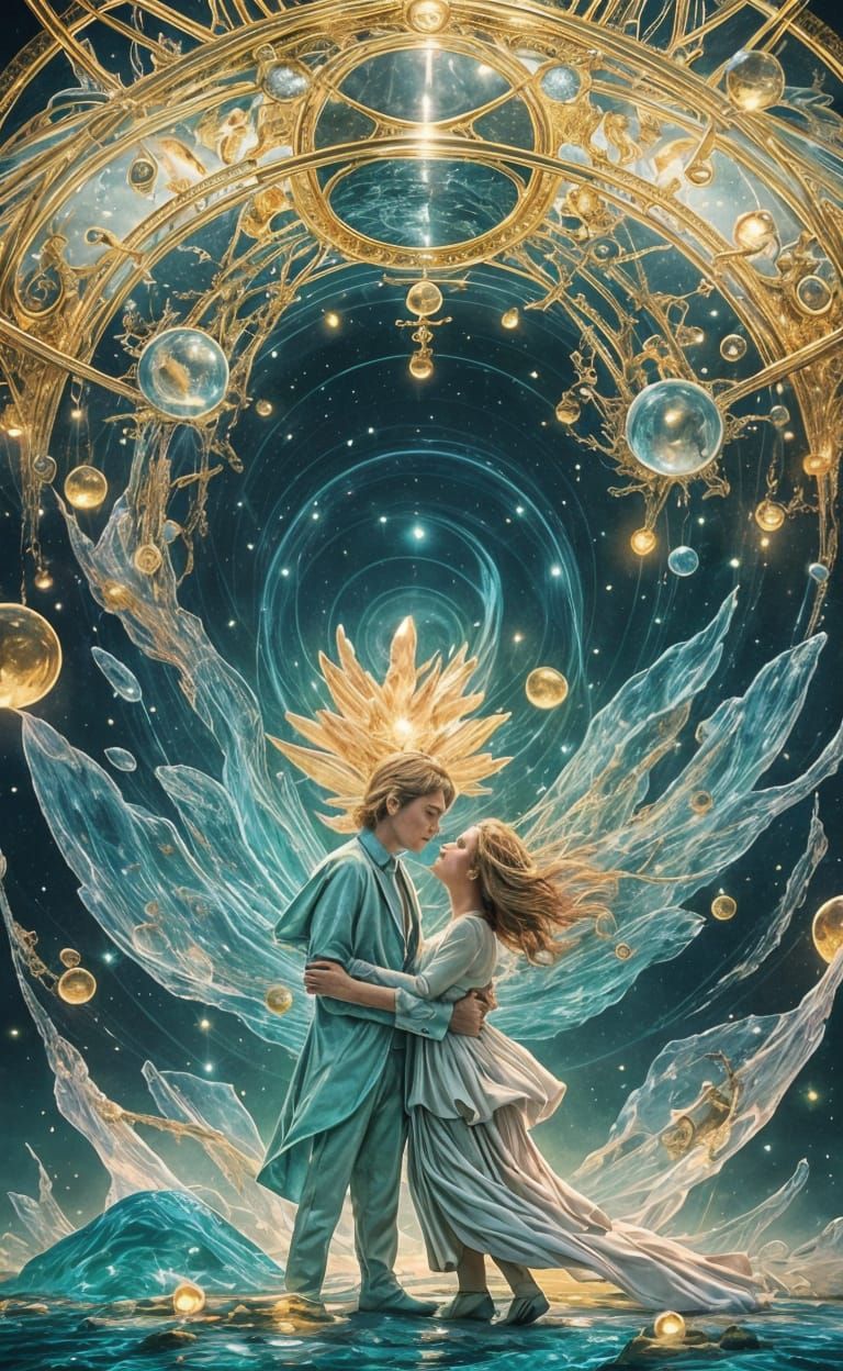 This image shows a couple embracing amidst floating islands connected by glowing bridges, rendered in a 1970s airbrush art style with soft gradients and pastel colors.
