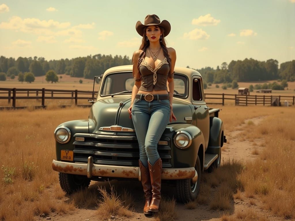 This image shows a 1950s pinup model in western attire, leaning on a vintage Chevy pickup truck in a rural field. The style is an epic, cinematic digital matte painting.