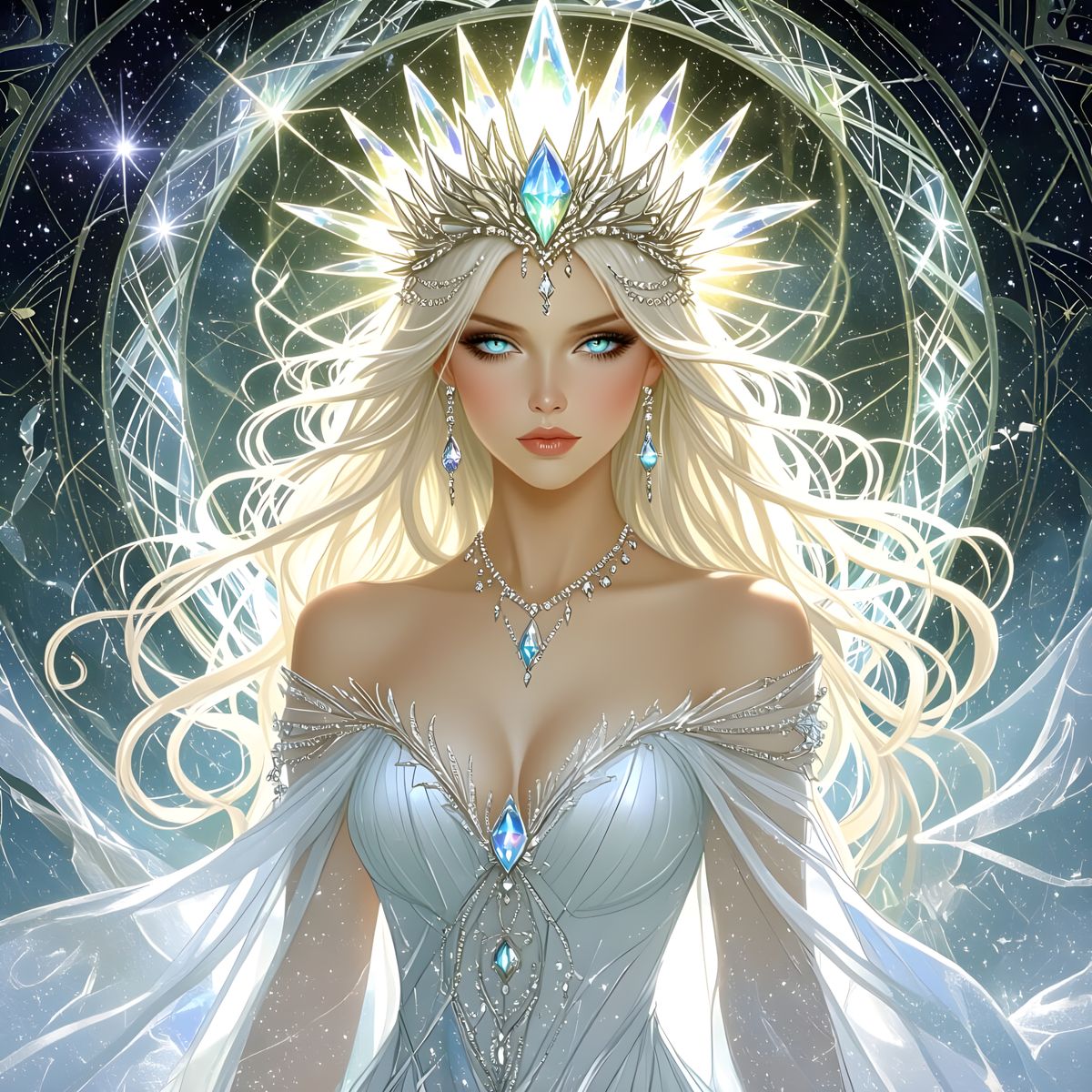 This image shows a crystal sorceress with gem eyes and diamond hair, wearing a quartz crown. She stands in swirling crystalline energy with starlight and ethereal shadows, wearing a crystal gown, in a gothic art style.