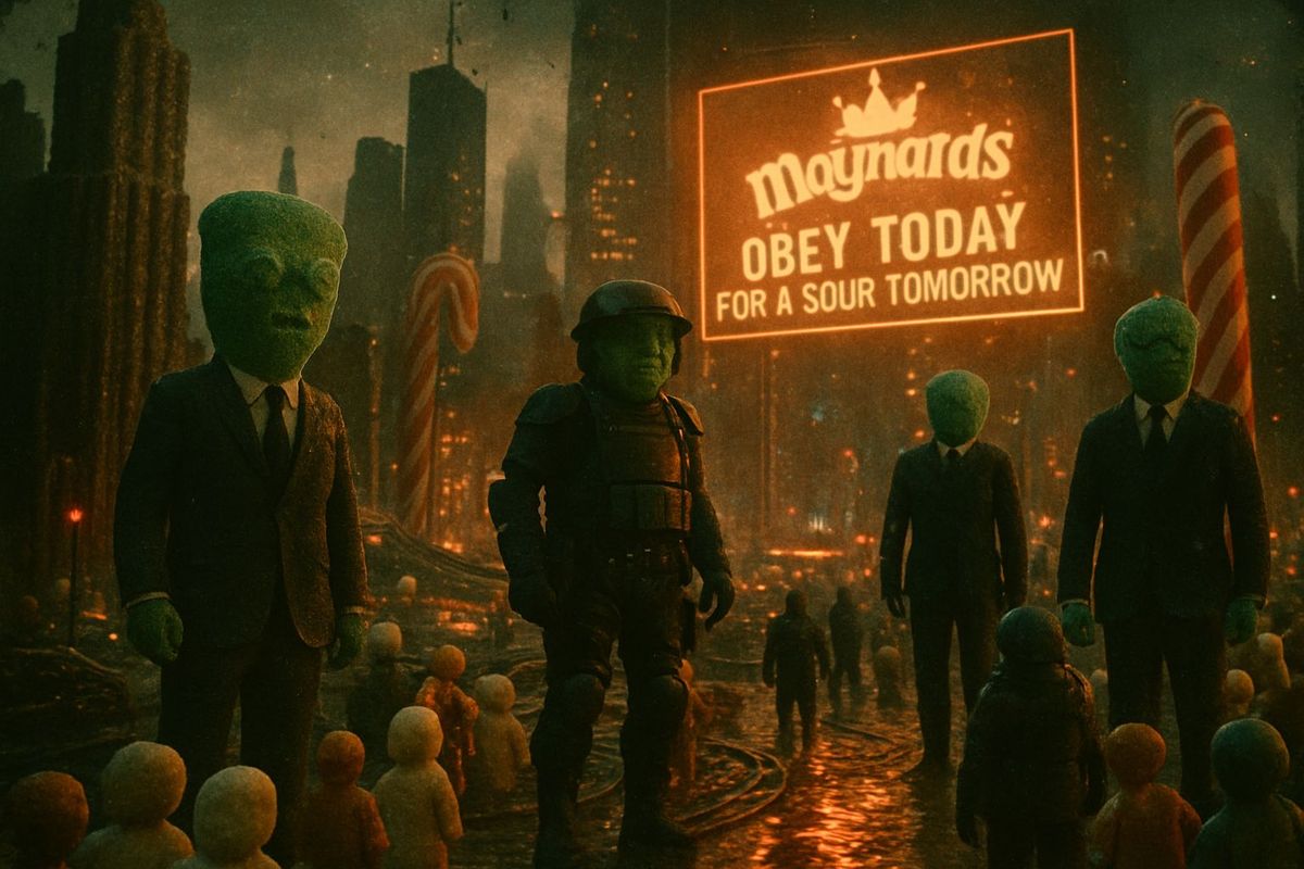 A grungy, cinematic analog photo depicts a sprawling candy megacity under authoritarian rule. Towering candy skyscrapers, licorice highways, and corporate billboards create a dark, surreal, and dystopian atmosphere.