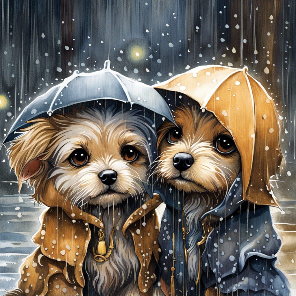 A charming watercolor painting of two small, soaked dog companions seeking shelter from the rain. The digital artwork uses vivid colors, rim lighting, and pen and ink techniques.