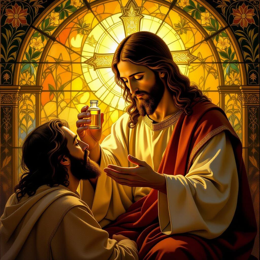 This image depicts Jesus administering cannabis oil to a follower in a richly colored, stained-glass illuminated setting. The scene evokes the dramatic and detailed styles of Renaissance and Symbolist art.