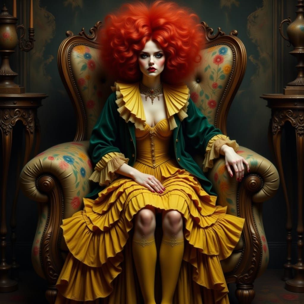 A striking portrait of a woman with voluminous red hair, seated regally in an ornate armchair. She wears a dramatic ruffled yellow dress and velvet jacket, rendered in a 1920s oil painting style with rich textures.