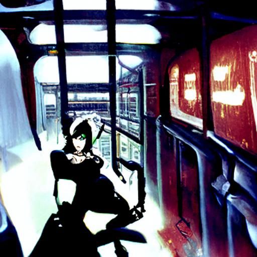 This image shows a slender, tattooed woman with dramatic makeup, seated in a subway car. She wears a leather jacket and mesh stockings, rendered in a cel-shaded anime style.