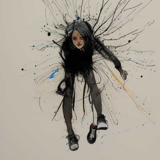 A black ink drawing of a young woman experiencing mania. The artwork, reminiscent of Ralph Steadman's style, features wild, scratchy strokes and blotches on yellowing paper.