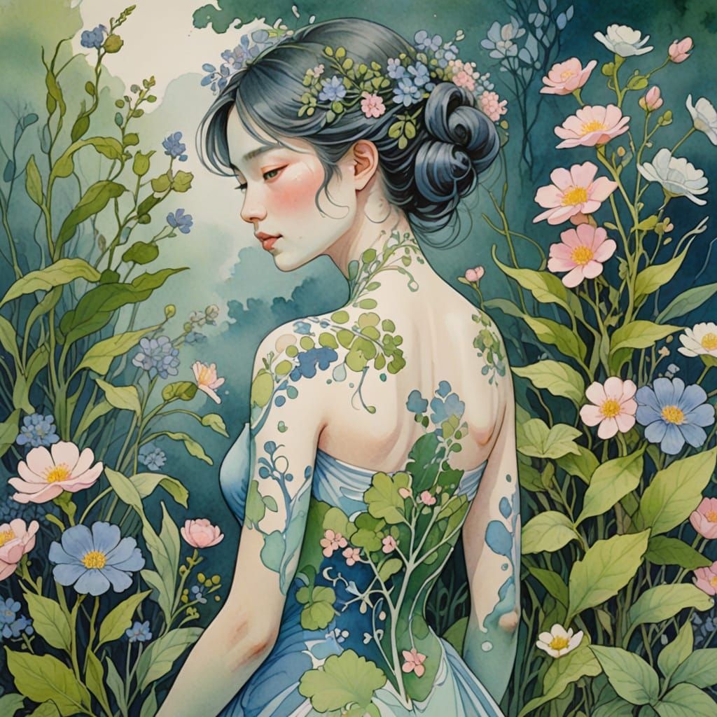 This image shows a woman adorned with body paint and flowers. The artwork evokes watercolor and gouache techniques, reminiscent of Ghibli and Moebius styles, in pastel hues.