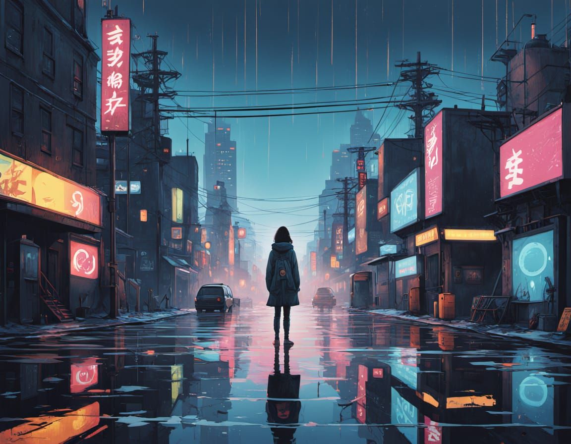 A striking picture of a woman in a vibrant cityscape. The artwork features dynamic lighting, hyper-detailed textures and cel-shaded reflections in a futuristic, postmodern style.