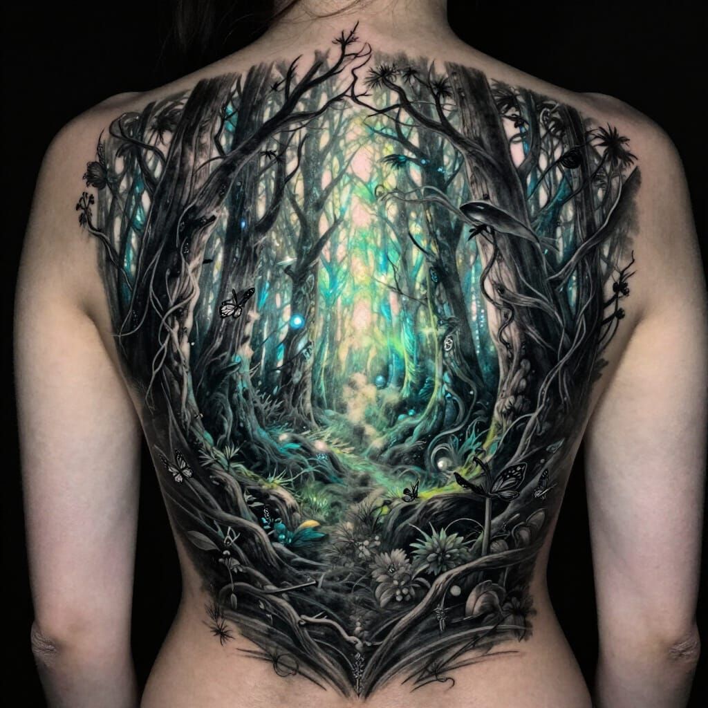 A hyperdetailed charcoal drawing tattoo design of a mystical, luminous forest on a woman's back. Features intricate linework, dark ambiance, and dramatic chiaroscuro lighting.