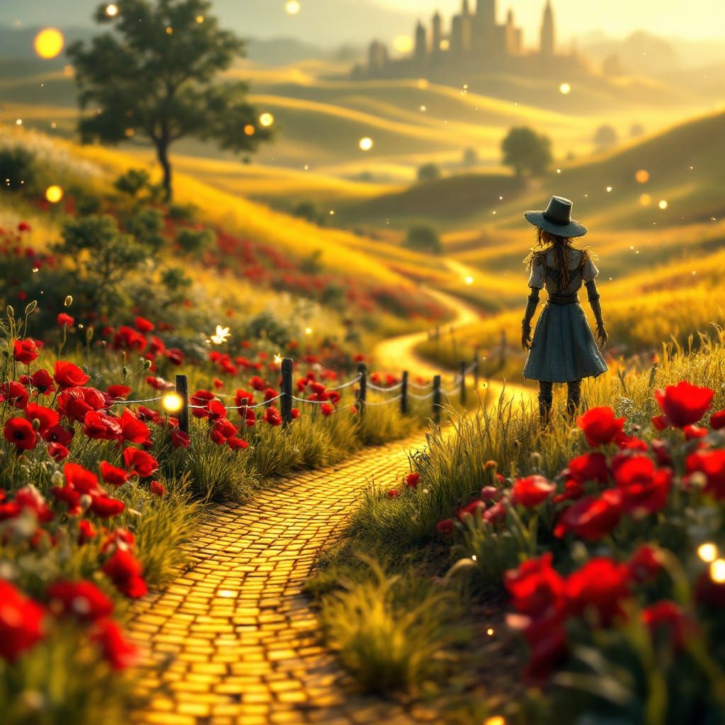 This image shows a detailed miniature of Oz with a golden brick road, poppy fields, and the Emerald City. Cinematic lighting and atmospheric fog create a magical, epic scene.
